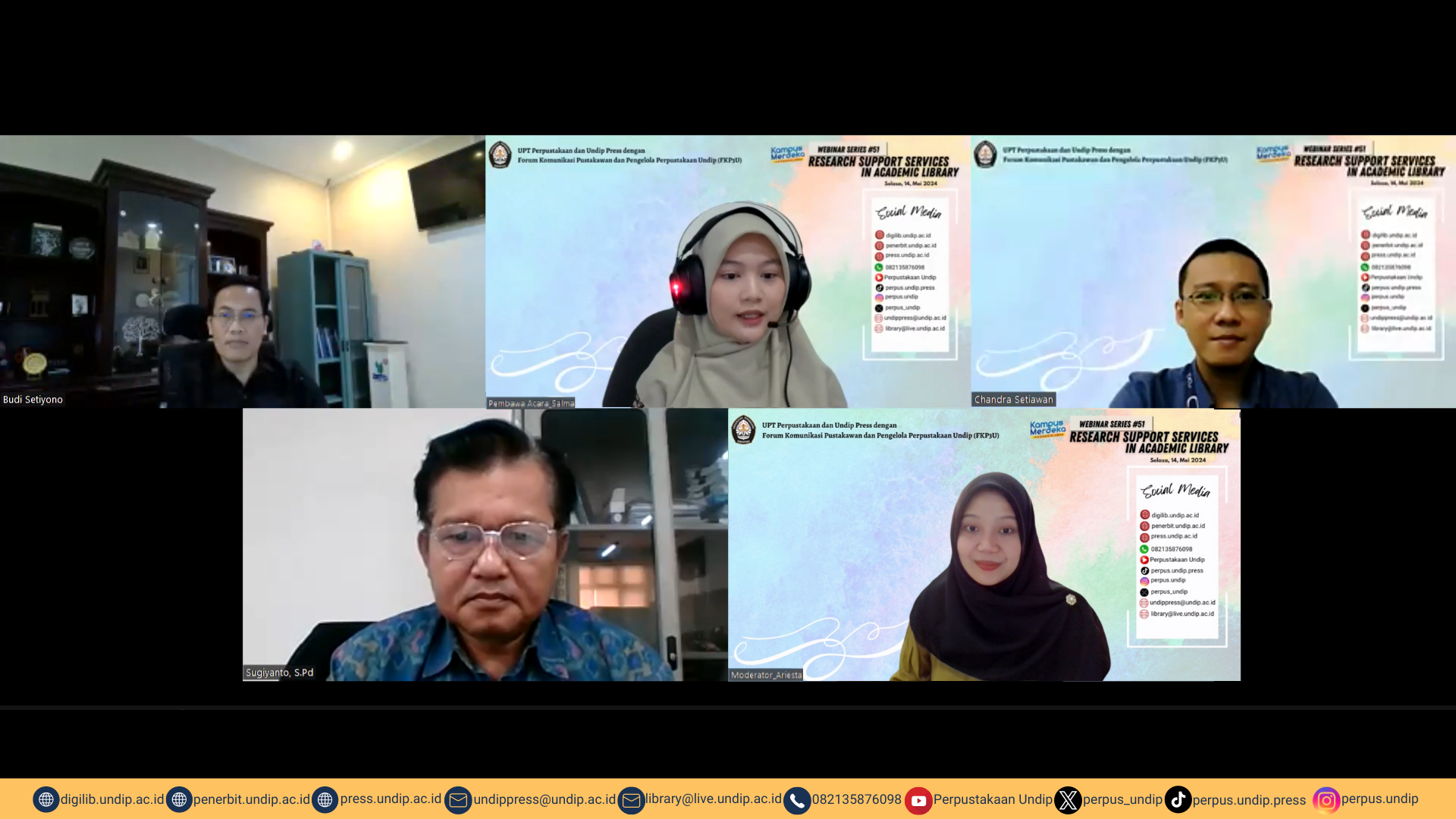 Selasa, 14 Mei 2024 UPT Perpustakaan dan Undip Press bekerjasama dengan Forum Komunikasi Pustakawan dan Pengelola Perpustakaan Undip menggelar webinar series #51 dengan judul Research support services in academic library (Layanan untuk mendukung penelitian di perpustakaan akademik) yang selanjutnya disebut dengan RSS. Narasumber yang dihadirkan adalah Chandra Pratama Setiawan, M.Sc. yang merupakan Kepala Bidang Manajemen Koleksi dan Teknologi Informasi di Universitas Kristen Petra, Surabaya.