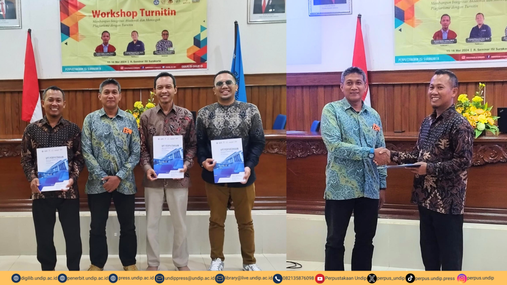 Pustakawan Ahli Muda UPT Perpustakaan dan Undip Press menjadi narasumber dalam Workshop dengan Tema: “Membangun Integritas Akademik dan Mencegah Plagiarisme dengan Turnitin” di UPT Perpustakaan ISI Surakarta pada tanggal 15-16 Mei 2024. Peserta berjumlah 50 orang yang terdiri dari pemegang akun Turnitin ISI Surakarta yaitu dosen, staf tendik, pustakawan dan pengelola akun jurnal. Adapun Narasumber & Moderator yaitu :