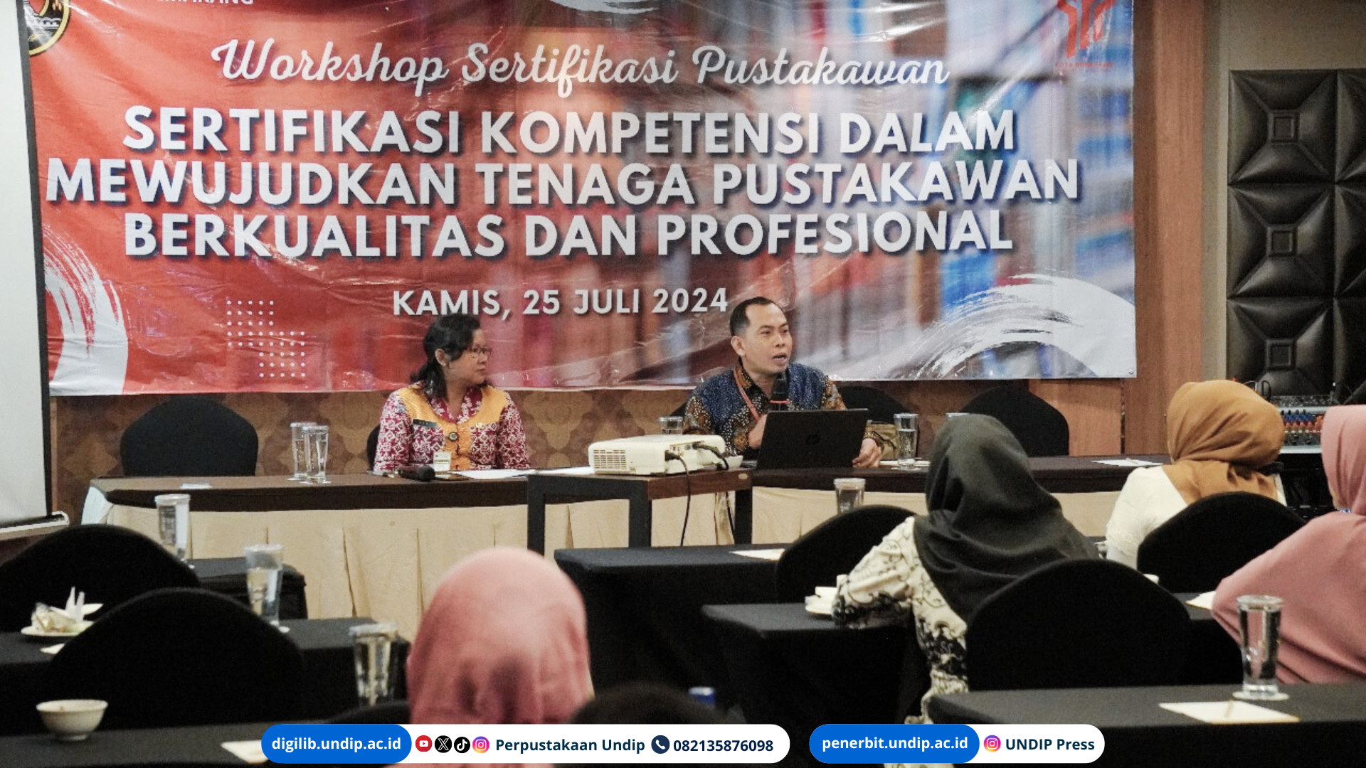 Kamis 25 Juli 2024, Suwondo, S.Hum., M.Kom. Kepala UPT Perpustakaan dan Undip Press menjadi salah satu narasumber pada workshop “Sertifikasi Kompetensi dalam Mewujudkan Tenaga Pustakawan Berkualitas dan Profesional”. Kegiatan ini diselenggarakan oleh Dinas Arsip dan Perpustakaan Kota Semarang secara Daring dan Luring. Tidak hanya beliau, pada workshop ini juga menghadirkan beberapa Narasumber diantaranya Kepala Dinas Arpus Bapak Bambang Suranggono, S.Sos, Indra Astuti, SS., MP. dari Perpusnas RI, Anggota Dewan Komisi D DPRD Kota Semarang, dan Dyah Nugraheni, SS., MM. Ketua PD IPI Jawa Tengah.
