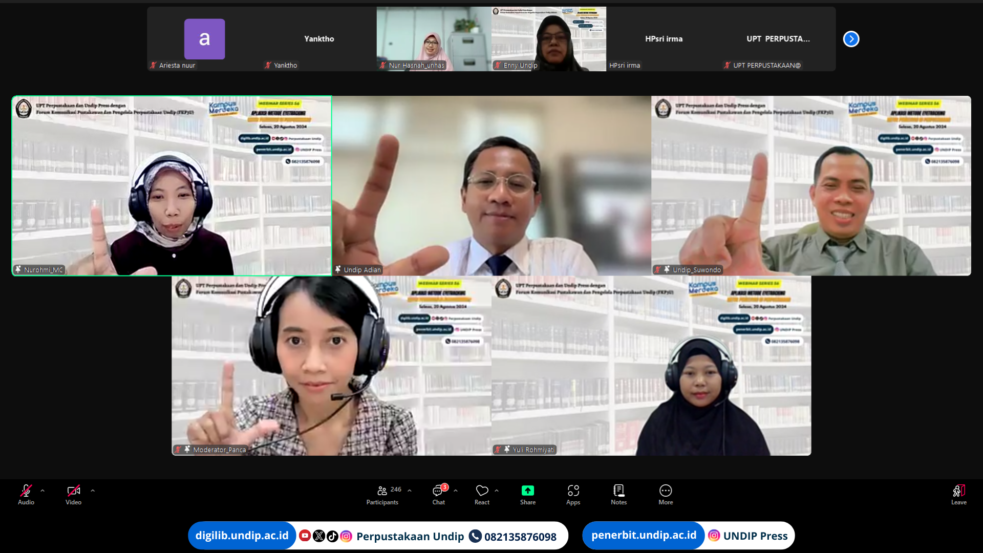 Rabu, 20 Agustus 2024  UPT Perpustakaan dan Undip Press melaksanakan webinar ke 56 dengan tema Aplikasi Metode Eye-tracking untuk Penelitian di Perpustakaan. Kegiatan ini dilaksanakan atas kerja sama UPT Perpustakaan dan Undip Press dengan Forum Komunikasi Pustakawan dan Pengelola Perpustakaan Universitas Diponegoro dan dibuka oleh Wakil Rektor bidang Komunikasi dan Bisnis, Prof. Dr. Adian Fatchur Rochim, S.T., M.T.