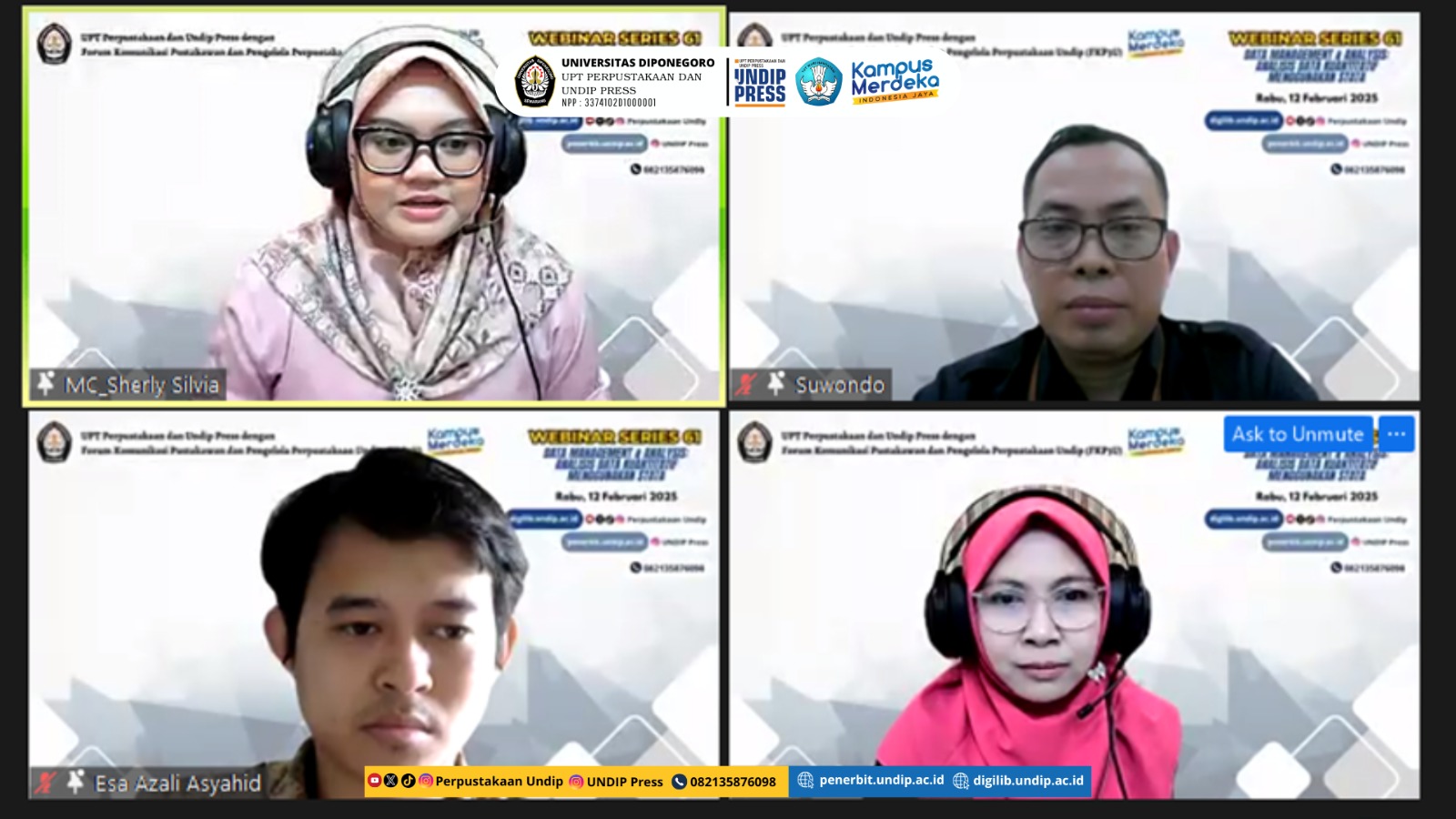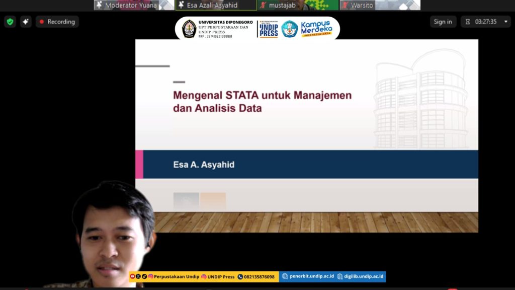 UNDIP, Semarang (12/2) – “Analisis data kuantitatif memerlukan perangkat lunak yang tepat untuk mengolah dan menganalisis data. Webinar ini membahas cara menggunakan Stata yang merupakan perangkat lunak statistik yang digunakan untuk analisa data, pengolahan data, dan visualisasi data. Aplikasi ini berguna dalam menunjang riset dan penulisan ilmiah bagi sivitas akademika. Semoga kegiatan ini memberi manfaat untuk mengetahui lebih banyak lagi tentang pentingnya pengolahan data kuantitatif menggunakan Stata,” hal tersebut disampaikan oleh Kepala UPT Perpustakaaan dan UNDIP Press, Suwondo, S.Hum., M.Kom. dalam acara Webinar #61 Data Management Analysis: Data Kuantitatif Menggunakan Stata yang diselenggarakan oleh UPT Perpustakaan dan UNDIP Press bekerjasama dengan Forum Komunikasi Pustakawan dan Pengelola Perpustakaan Universitas Diponegoro, secara daring melalui aplikasi zoom meeting, Rabu (12/2).