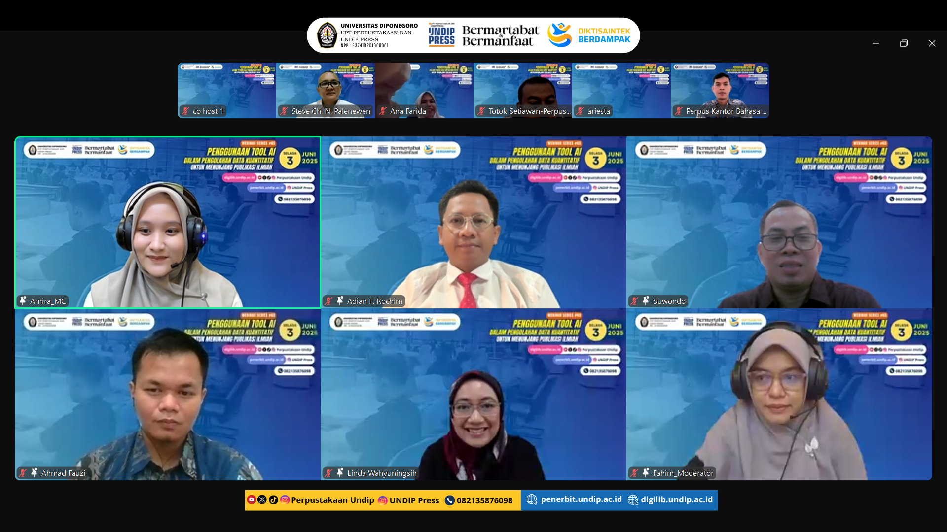 UNDIP, Semarang (3/6) – Dalam upaya mendukung visi dan misi Universitas Diponegoro, UPT Perpustakaan dan UNDIP Press menyelenggarakan Webinar Series #65 dengan tema”Penggunaan Tool AI dalam Pengolahan Data Kuantitatif untuk Menunjang Publikasi Ilmiah”, Selasa (3/6) melalui zoom meeting. Hadir sebagai narasumber, Ahmad Fauzi, M.Pd. (Dosen Fakultas Keguruan dan Ilmu Pendidikan Universitas Muhammadiyah Malang).