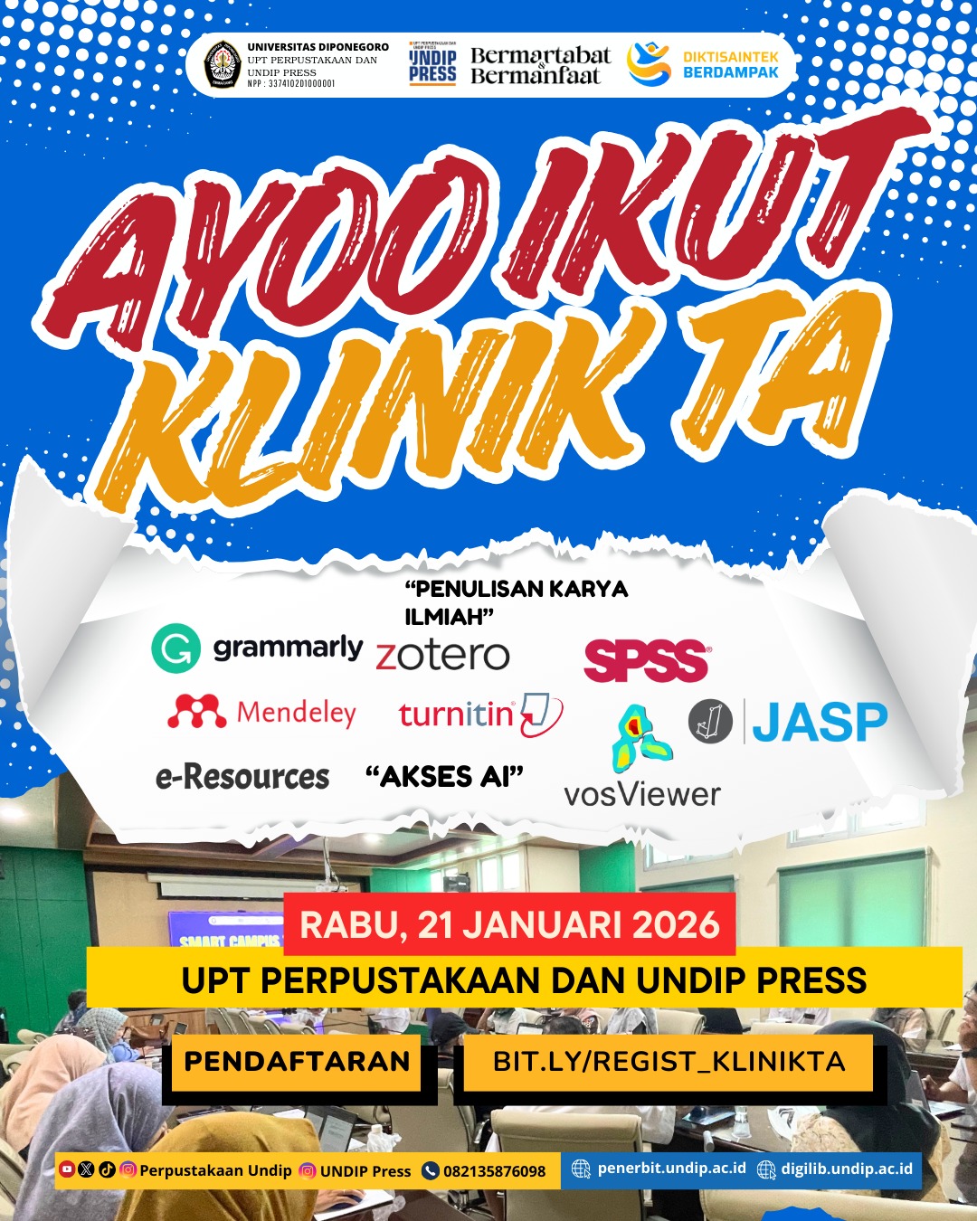 Punya tugas akhir atau skripsi yang lagi dikejar? Jangan khawatir! Yuk ikutan Klinik TA bareng UPT Perpustakaan dan UNDIP Press 🎓